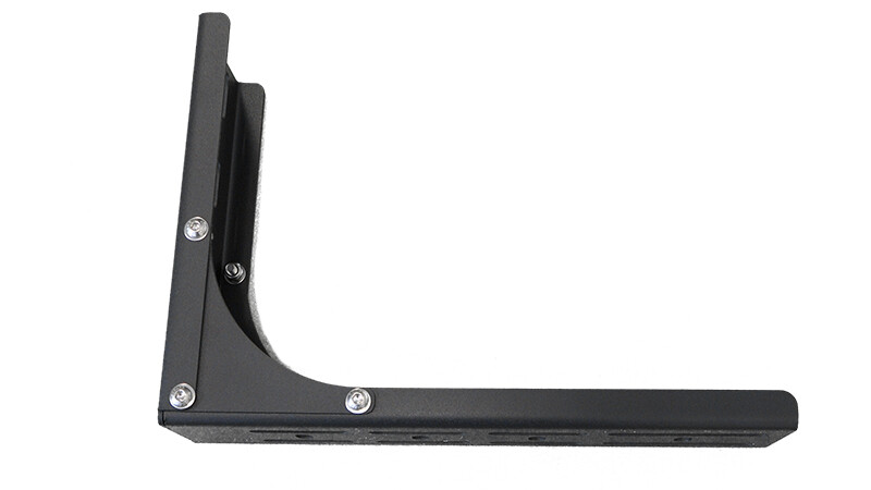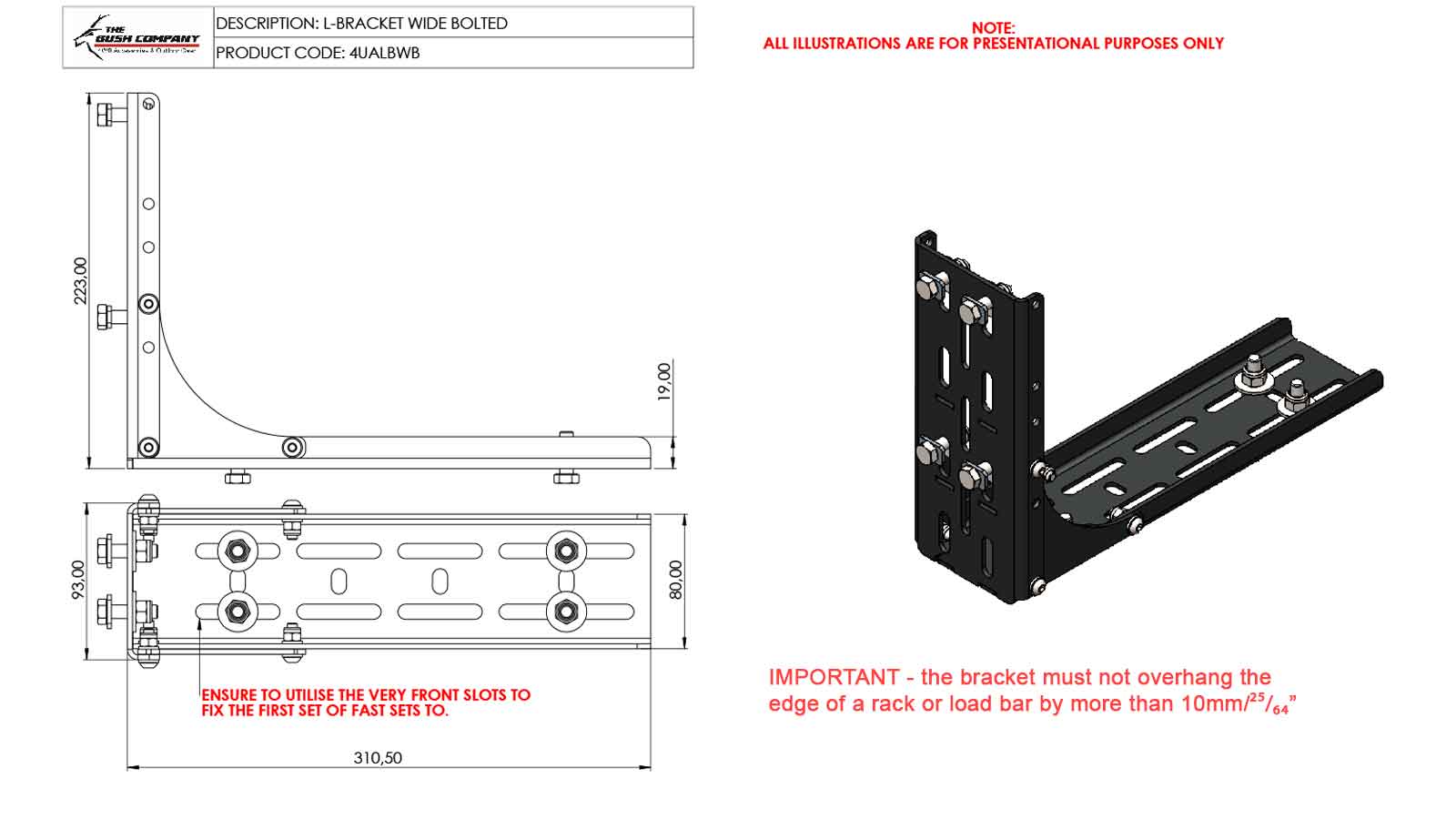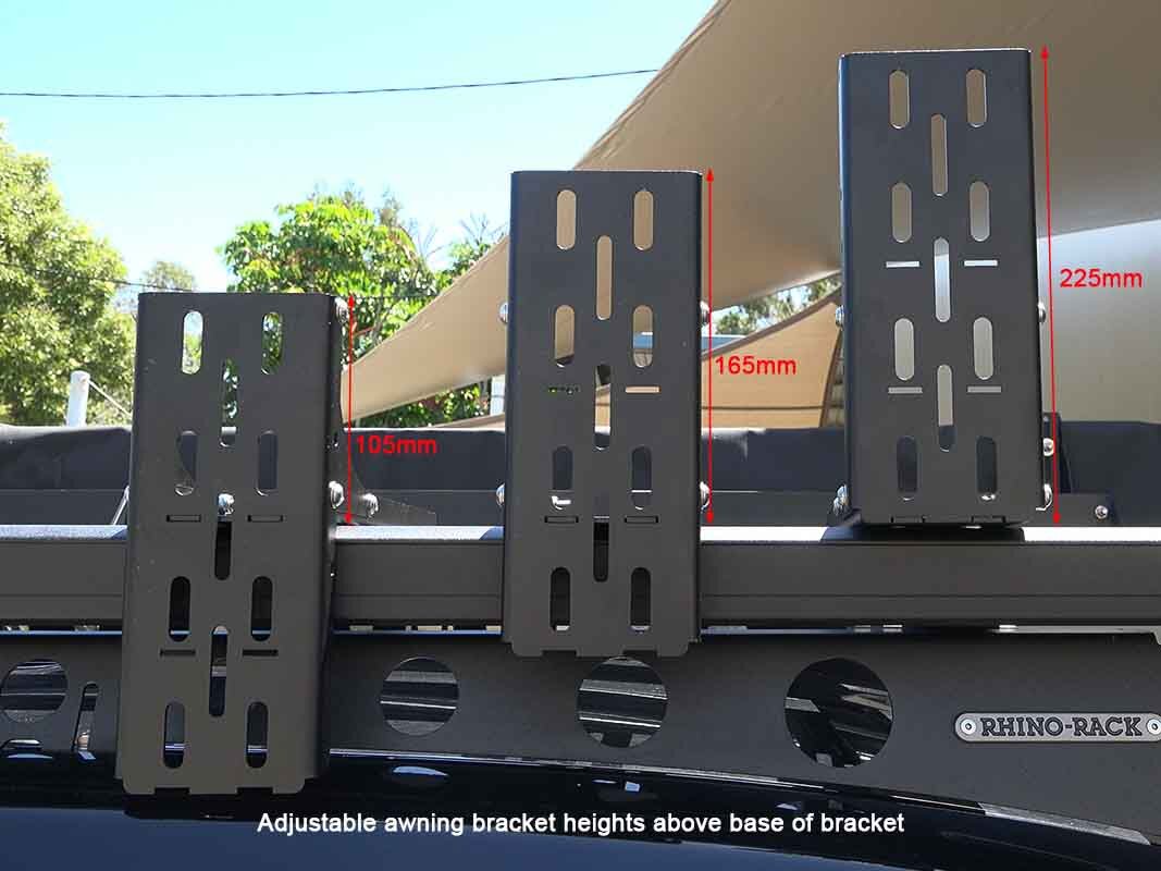 For any awning it is important that the bracket can support the weight of the awning in off-road conditions and when in use, especially the larger 270 degree awnings. The Heavy Duty L Bracket has been designed to suit The Bush Company USA awnings when fitted to load bars or a roof rack. The bottom arm which attaches to the load bar or roof-rack is 310mm (12 ¹³/₆₄”) long and 81mm (3 ³/₁₆”) wide with a range of holes and slot options for attachment, this longer arm is ideal for fitment to roof racks with wider slats where the attachment points are further apart such as a Rhino Pioneer Platform Rack. The vertical arm of the brackets can be configured in three positions enabling the height above the rack to be adjusted from either 225mm (8 ⁵⁵/₆₄”), 165mm (6 ¹/₂”) or 105mm (4 ⁹/₆₄”).