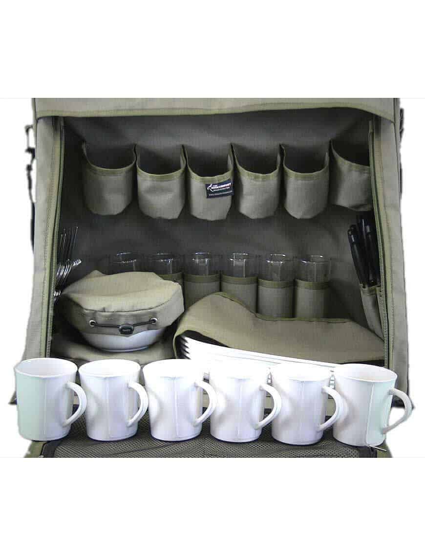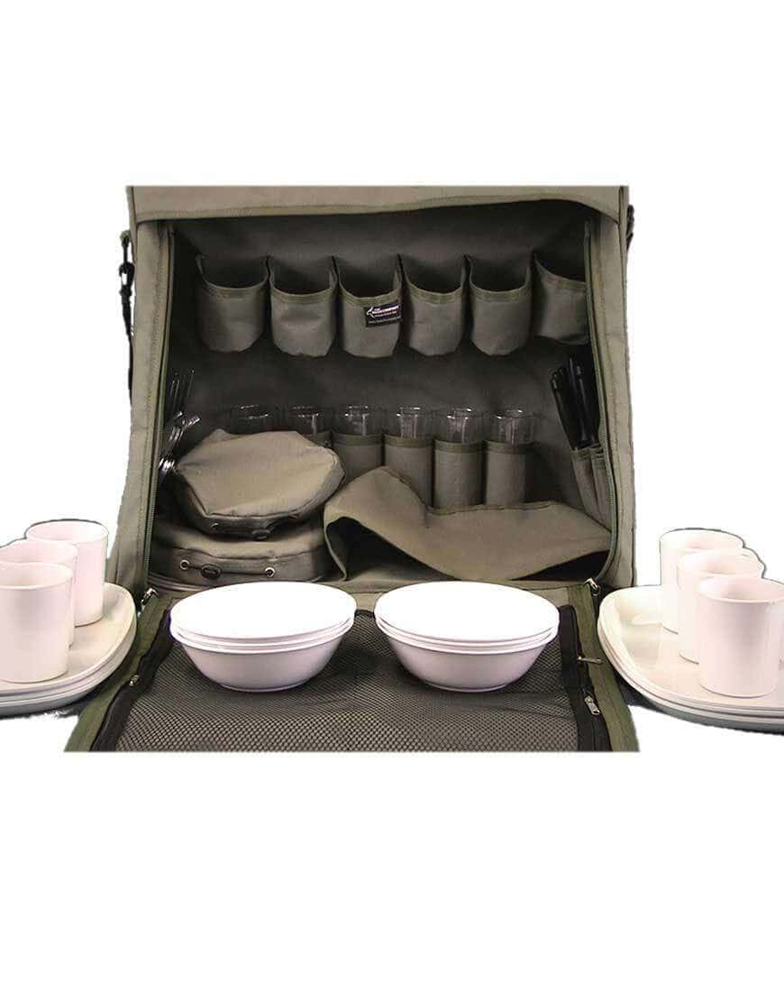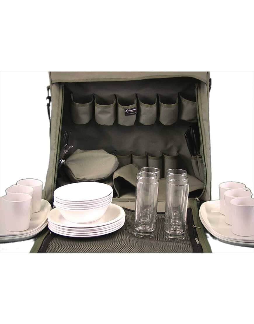 The bag is made from 420g thick rip stop canvas and has high quality YKK zippers. The dimensions of the bag are: Height 460mm, Width 600mm, Depth at Base 300mm, Depth at Top 100mm. All of the crockery is made from high quality melamine and is microwave safe, there are dedicated storage holders for your dinner plates (these are full size meat platters), side plates, bowls, mugs and tall glasses (real glass), as well as the 6 person stainless steel cutlery set which includes additional steak knives. The adjustable shoulder strap makes it easy to transport the whole set to your camping spot.