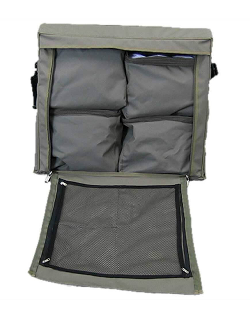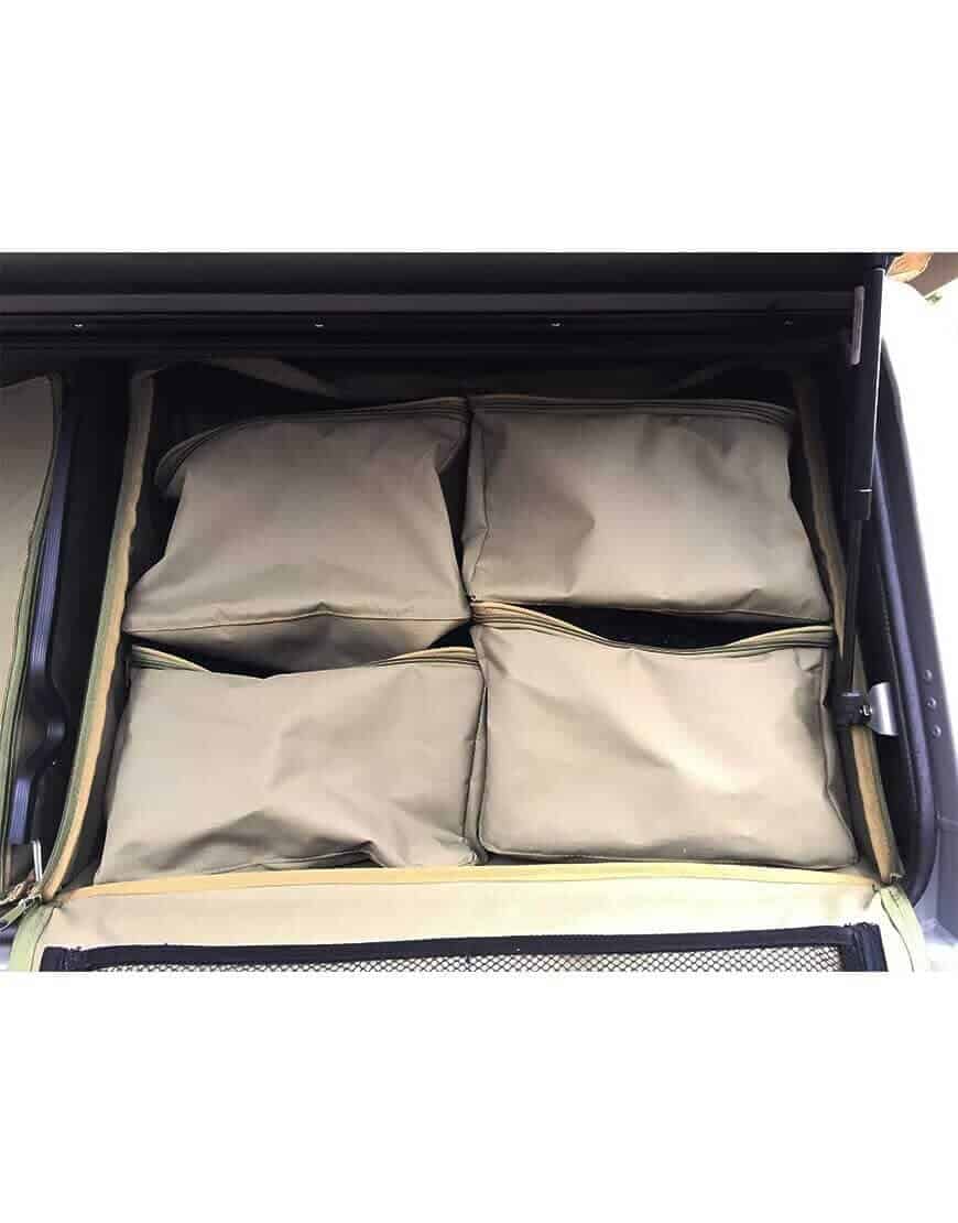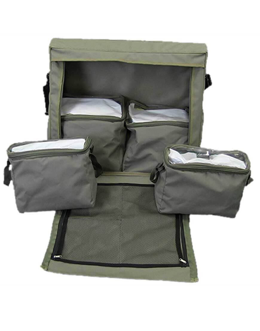 The inner storage bags are manufactured from strong ripstop canvas and have high quality YKK zips and a clear plastic lid to aid easy identification of items. The inner bags fit snugly into the outer carrying case which has been specially formed to fit into the gullwing shelves of a canopy.