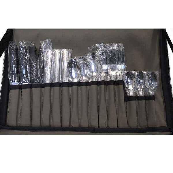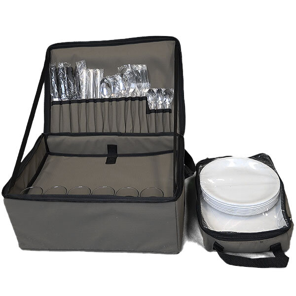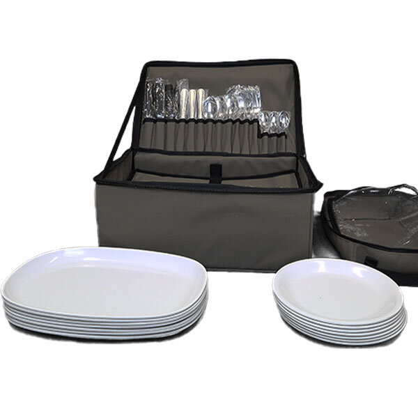 The stainless steel cutlery set with additional steak knives is stored in utensil sleeves on the underside of the lid of the case. A handy adjustable shoulder strap makes it easy to transport the set to your camping spot.