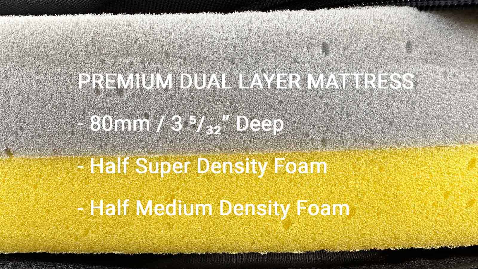 The mattress is dual layered medium and super density foam removable rip stop cover that provides a comfortable sleeping surface and can be removed for washing if required.